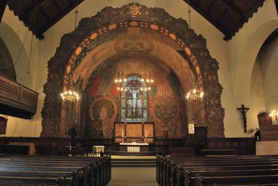 Fresker og glassmalerier av Enevold Thømt. Utvendig dekket av naturstein fra Nordmøre.