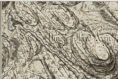 Kartet vise beliggenheten til husmannsplassen Øvre Lønhøyden og naboplassene Nedre Lønhøyden og Kalvberget. Vannet nær Kalvberget er Kalvbergtjennet. Alternativt kart, se Lønnhøgda midtre. Kartverkets historiske arkiv (1781).