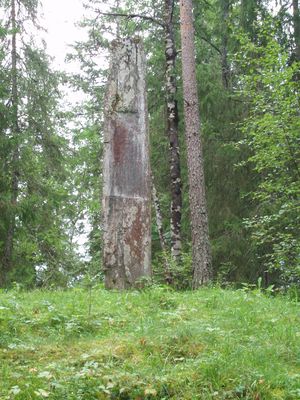 | Af Bautastene er ingen siden opdaget, dog er een (…) 1835 oprejst paa Klippen vestenfor Præstegaarden den 17 Maji den haver kun hine 6 Figurer indskaaren paa en poleret Flade. I øvrigt er den aldeles raa, som en sedvanlig Bautasteen. Det er ellers mærkeligt at den paa nævnte Dag Kl: 10 Formiddag blev trukken paa Skaren af Søndagsskolens Elever, paa den Tid plejer ellers at være den bedste Sædetid. | ||