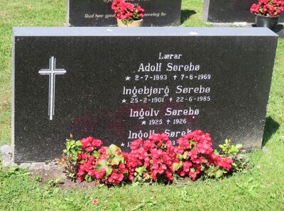 Adolf Sørebø er gravlagt i familiegrav på Austbygde kirkegård i Tinn kommune. Tittelen Lærar er benyttet på gravminnet.