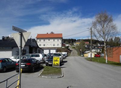 Agmund Holes veg sett fra Raufossvegen. Den store hvite bygningen midt på bildet er tidligere Blomhaug skole, som er ombygd til leiligheter.