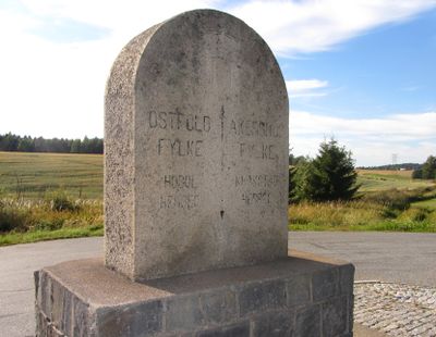| Grensesten med kong Haakon 7.s monogram ved RV 120 på grensen mellom Enebakk (Akershus) og Hobøl (Østfold). Foto: Siri Johannessen (2016). .