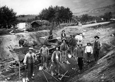 Rallarer og slusker var omflakkende anleggsarbeidere som bygde ut jernbaner og annet i Norge. Fotografiet viser arbeidslaget til Hans H. Kirketeigen i Kvam i Nord-Fron i juni 1896. Dovrebanen gjennom Gudbrandsdalen ble bygd på midten av 1890-åra, og skapte mange nye arbeidsplasser for husmenn.