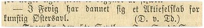 "I Fjære Sogn ved Arendal har der dannet sig en Forening til Anlæg af en kunstig Østerspark. Efter Anmodning fra dennes Formand, Sagfører Carl Boe, har det kgl. Selskab for Norges Vel ladet B. Hansen i Stavanger, der ifjor paa Selskabets Bekostning foretog en Reise til England og Frankrige for at undersøge de derværende Østersparker, bistaa Foreningen ved Anlægget, der nu under hans Tilsyn er bragt i fuldstændig Stand. Da det til Anlægget valgte Sted er meget heldigt beliggende, og da særdeles Omhu er anvendt, saavel ved Parkens Rensning som ved Yngelsamlernes og Stamøstersenes Nedlægning, er det at haabe, at Forsøget vil lykkes. (Aftp.)"