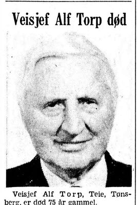 | Veisjef Torp sitter meget utsatt til når det gjelder kritikk. Intet er så populært som å klage på dårlige veier, men Alf Torp har evnen til å se noe positivt i selv den mest usakelige og sure kritikk. For ham er yrket en hobby, men som en god hobby nr. 2 kommer seiling. Han har seilt siden 1913 og har hatt mange båter. Nu seiler han en 8-meter, en riktig fin turbåt. | ||