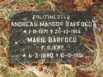 Andreas Mangor Barfoed er gravlagt i familiegrav på Vår Frelsers gravlund i Oslo. Tittelen Politimester er benyttet på gravminnet.