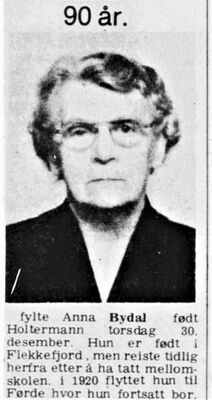 - ↑ 002 Anna Engel Holtermann Bydal - 0068 Forthun - 004 Tellingskrets 4 - Tellingskretsoversikt - Folketelling 1920 for 1433 Naustdal herred - Digitalarkivet