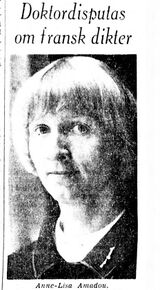 Faksimile fra Aftenposten 3. juni 1966: utsnitt av omtale om at Anne-Lisa Amadou hadde disputert for dr. philos.-graden.