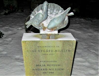 Arne Nygård-Nilssen er gravlagt sammen med sin kone, billedhuggeren Maja Refsum, på Ullern kirkegård i Oslo.