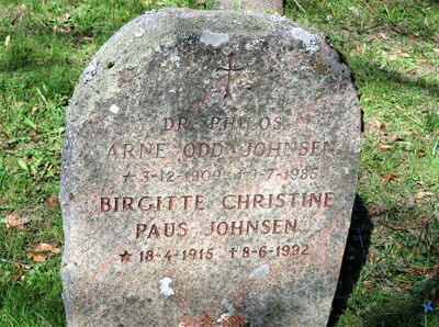 Arne Odd Johnsen er gravlagt på Haslum kirkegård i Bærum. Tittelen dr. philos. er benyttet på gravminnet.