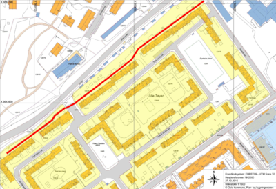 Part fra Aud Schønemanns vei, støyskjermen mot Økernveien i venstre bildekant.