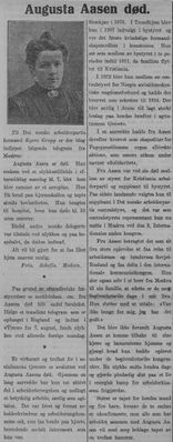 Det var nok ikke noen tilfeldighet at det var i Odda at spørsmålet om prevensjon ble tatt opp. Der var industrianlegg med stort gjennomtrekk av folk som arbeidet på de forskjellige anleggene. Men lokalbefolkningen lot seg altså sjokkere – og legg merke til at Augusta holdt talen i 1912 – Leksikonet skrev dette i 1933.