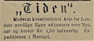 20. desember 1889 skrev Tromsø Amtstidende at et «moderat Høireblad» med navnet «Tiden» var «under opseiling». Lenger ute i avisa fant man en annonse der det ble kunngjort at «Tiden (som var en) moderat konstitutionel Avis for landets nordlige Egne udkommer over nytaar og koster Kr. 1,50 Halvaarlig. Expedition Harstad».