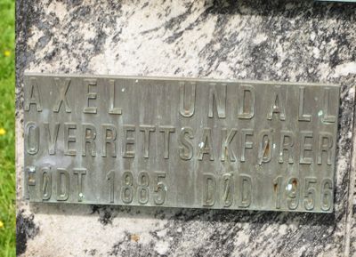 Axel Undall er gravlagt på Vestre gravlund i Oslo. Tittel Overrettsakfører er benyttet på gravminnet.