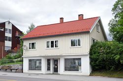 | 83 | Gnr. 53/291. Tomta på ca. 1 da blei utskild frå Prestegarden i 1921 som tomt nr. 10 og bortfesta til Bø sparebank. I 1933 blei kontrakten overført til bakar Peder Olsen frå Tvedestrand som sette opp huset same året. Her åpna han konditori og kafé 15. november som han dreiv til 1956. Sonen Olav Bratland overtok eigedomen i 1964. Dei dreiv også Olsens kafé i mange år. Etter desse dreiv bakar Johs. Soterud frå Gvarv «Kafehjørnet». Sylva Johansen dreiv «Sylva's Kafe» frå 1983. Fra 1986 holdt Puben «Stallkroa» ved Stein Helge Østerli til her. | |