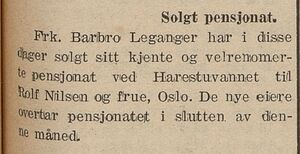 14. juni 1938 fortalte avisa Hadeland at Barbro Leganger hadde «solgt sitt velrennomerte pensjonat ved Harestuvannet» til Rolf Nilsen og frue fra Oslo.