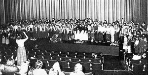 Fra den 5. internasjonale barne- og ungdomskorfestival Nord i Tromsø 1980. Foto: Troms Sangerforbund 75-års Jubileumsskrift, Tromsø 1988.