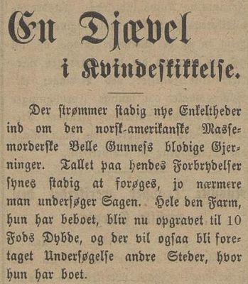 Ryktene svirra i LaPorte: Ho hadde vore horemamma i Chicago, ho lagde pølser av ofra, og ho hadde tatt livet av rundt førti menneskje. Dette var usant eller overdrive, men at ho hadde tatt livet av mange var det ingen tvil om.