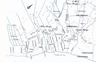 Historiske stiar og vegar til Berge i Høyanger. Kartet er teikna av Sverre Berge (1933-1993).