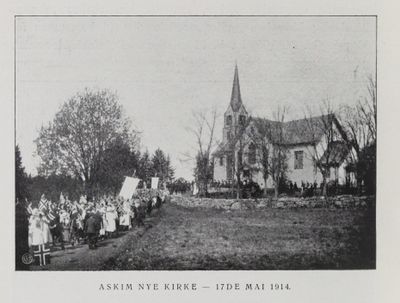 Askim kirke den 17. mai 1914. Fotografi fra boka Askim herred 1814-1914 av A. Haaheim (1914).