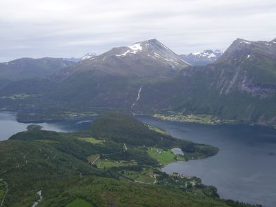 Utsyn over Austefjorden og Snøhornet frå Middagshornet.