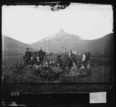 Solvågtinden/Sávvlotjåhkkå sett fra Junkerdal gård, gruppe av personer i forgrunnen, andre halvdel av 1800-tallet.