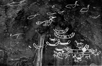 Helleristninger med jordbrukssymboler fra rundt 500 før vår tidsregning på Hammer i Beitstad i Steinkjer kommune. Illustrasjon fra boka Nord-Trøndelag i bilder, utgitt 1957.