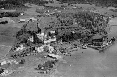 Flyfoto over gruvebyen Malm, tidligere administrasjonssenter i Verran kommune, nå del av Steinkjer. Illustrasjon fra boka Nord-Trøndelag i bilder, utgitt 1957.