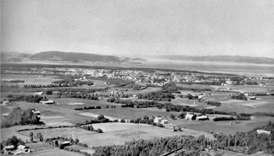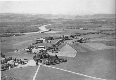 Utsikt over Stiklestad i 1957, Stiklestad kirke i forgrunnen. Fotografi fra boka Nord-Trøndelag i bilder (1957).