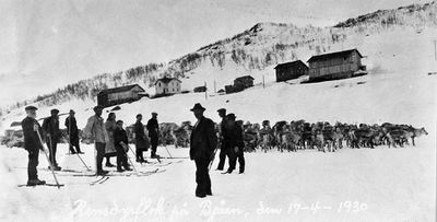 | «Bjaaen Turiststation» ca 1903. Mannen med det store skjegget er Knut B. Bjåen, til høgre for han står kona, Torbjørg S. Bjåen, og til venstre står Borgny Abrahamson frå Kristiansand, dotter åt August Abrahamson, han som tok biletet. Huset i bakgrunnen er Nor i stoga, det næraste er Su i stoga, som var turiststasjonen. Bilete frå Setesdalsmuseet. | |