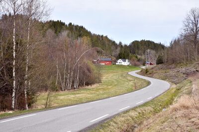 Bjørndalsveien med gården Solhaug (gnr. 4/10) sett nordover.