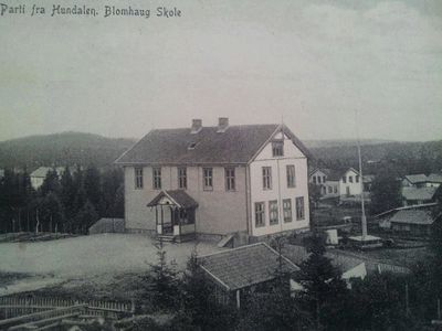 Blomhaug skole ble innvia i 1905, etter at kretsen fra ca. 1894 hadde hatt skole i forskjellige leide lokaler i Hunndalen (bl.a. Stenberg, Stenvold og Framnes). Tidligere hadde Mustad-arbeidernes barn gått på fabrikkskolen på Brusveen, mens de andre ungene i Hunndalen avhengig av bosted hadde søkt til henholdsvis Vindingstad, og Hunn (Valhalla).