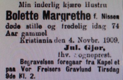 - Aftenposten 8. november 1909; dødsannonse for Bolete Gjør