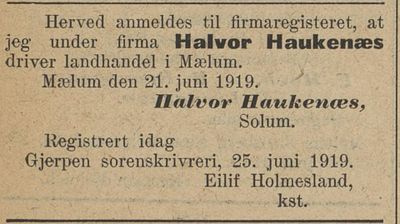 Brødrene Haukenæs Landhandleri ble startet av Halvor og Andreas Haukenæs i 1919, men det er bare Halvor som står oppført i handelsregisteret fra 1919. Landhandelen lå på Mælum på vegen mellom Skien og Ulefoss i nåværende Skien kommune.