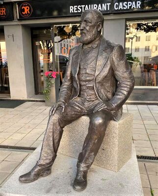 Minnesmerke over Caspar Donato Brambani utenfor Brambanigården i Sandvika, utført av Ellen Jacobsen (2017).