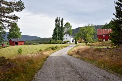 Veien Breili med gården Lensegrav sett mot Singusdalsveien.