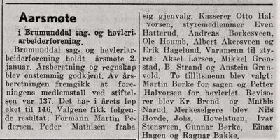 Faksimile fra Hamar Arbeiderblad 14. januar 1937; utsnitt av omtale av årsmøte i Brumunddal Sag- og Høvleriarbeiderforening.