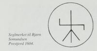 Norsk bumerke: Et kors med to haker og sparre på korsarmene. Tegning av segl fra 1604