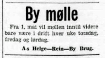 Selskapet Helge-Rein-By Brug kjøpte By gård i 1896 og også gårdens kornmøller ved Byafossen var inkludert i kjøpet. Selskapet bygget tresliperi ved fossen på sørsiden og avviklet mølla «Helge» som lå her. I 1898/1899 ble det bygget en ny mølle på nordsiden med seks kvernsteiner, grynkvern, to skallsteiner, rensemaskin og tørker. Den fikk også innstallert to turbiner, hver på 60 hestekrefter.
