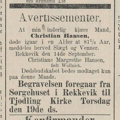 Christians far, Ludvig, benyttet i likhet med sin far, etternavnet Hanssen ved folketellingen i 1865. På familiegravstedet i Tjølling har Ludvig Hanssen fått familienavnet Rekkevik. Dette må enten ha vært et steds- eller gårdsnavn, ettersom vi også har sett at Christian Hansen Wollnick er oppgitt å være født i Rekkevik. Hans mor står derimot, kun oppført med etternavnet Hanssen på nevnte gravminne. Ludvig Hansens mor, altså Christian Hansen Wollnicks farmor, var Christiane Margrethe Christiansdatter Wollnick, født 31. mai 1811 som femte barn av Christian Wolnik, og Maren Christine Hansdatter Tagtved (født 1778). Det er foreløpig usikkert hvilken forbindelse, om noen, det er til Wollnick/Wöllner-familien som på 1700-tallet befant seg på Kongsberg.