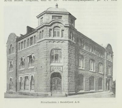 Det norske næringsliv er en fin kilde til fotografier av norske bedrifter i 1940- og 1950-åra. Her bygningen til Privatbanken i Sandefjord A/S.