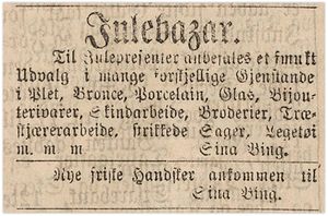 - Larsine Nicoline Helene Bing (Sina), født i Christiania 1833. I 1865 og 1875 er hun ugift og handlende. I 1885 driver hun handel med broderi og garn. sammen med søsteren Margrethe. Hun døde i Grimstad i 1896, 63 år gammel.