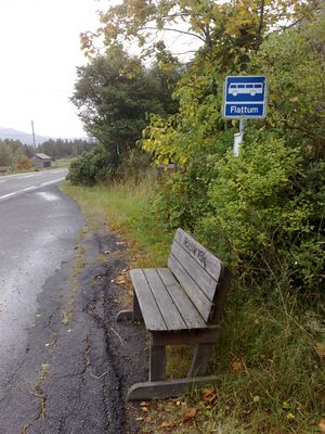 Drolsum Vel har satt ut benker på busstoppene ved riksveg 35. Her er holdeplassen ved garden Flattum.