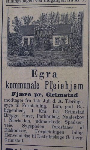 - I 1905 drøftet bystyret i Grimstad utfordringer i fattigvesenet, særlig med fokus på å få ned utgiftene. En komite anbefalte å kjøpe Egra som fattiggård. Men dette ble ikke realisert da.[9]