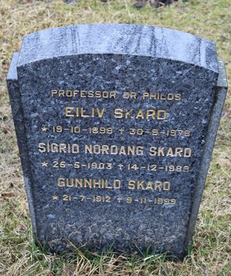 Eiliv Skard er gravlagt på Vestre gravlund i Oslo. Titlene Professor og Dr. philos. er benyttet på gravminnet.