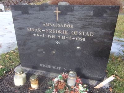 Gravminne, Haslum kirkegård. Gravskriften Requiesat in pace («R.I.P.») har sammenheng med at Ofstad var katolikk.