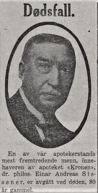 - Kjølberg, Ove: Einar Sissener - 1851–1931 i Norsk biografisk leksikon på snl.no. Hentet 19. november 2022 fra https://nbl.snl.no/Einar_Sissener_-_1851%E2%80%931931