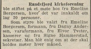 Da Randsfjord kirkeforening ble stiftet i 1945 var fru Tveter til stede og ble innvalgt i styret, her fikk hun ansvar for foreningskassa. Etter to år ble hun avløst som kasserer.