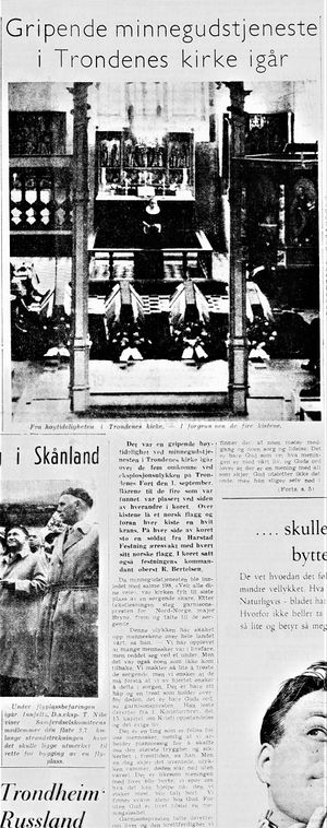 Sognepresten i Kvæfjord; Berg Rollnes deltok også i gudstjenesten. For øvrig var også sjefen for Distriktskommando Nord-Norge, generalmajor H. Edland, den fungerende sjef for Marinekommandoen, kommandør Kleppe, Harstad Festnings nestkommanderende, oberstløytnant Th. Mandt, og stabssjefen ved ØKN (Øverstkommanderende i Nord-Norge) kommandørkaptein Ø. Schall til stede. I Nordlys var og fokus på den gripende stunden, men med den forskjell at reporteren fortalte at det var kun fire kister i kirka, og at de nærmeste pårørende satt «på begge sider av alteret», samt at festningskommandanten var plassert ved prekestolen.