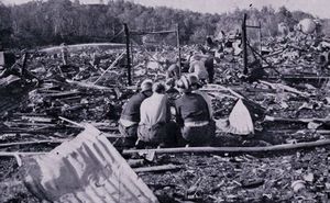 Jorda ristet under ham, hodet var fullt av lyd – lyder fra alt som svirrer rundt; bølgeblikk, sylskarpe sundrevne granathylser, splinter, jord, stein og planker. Røyken og kruttgassen sammen med lydene fra enkelteksploderende granater sto dirrende i lufta, sammen med den fryktelige flammesøylen som ville ete ham opp. Heksegryta var i full koking. Lorentzen lå bare få meter fra flammesøylen som snart kom opp i en høyde der den dannet en sopp-hatt som bredte seg ut over, lik en atombombesopp.